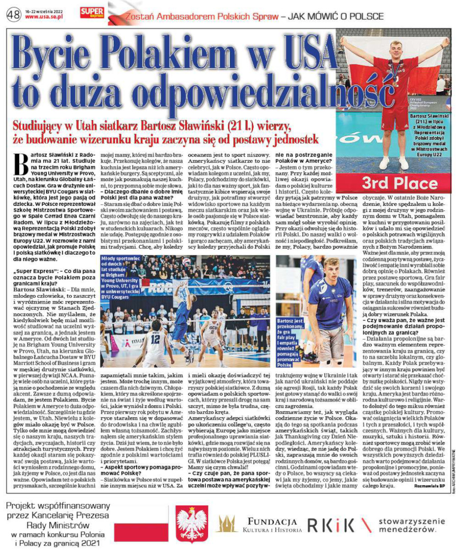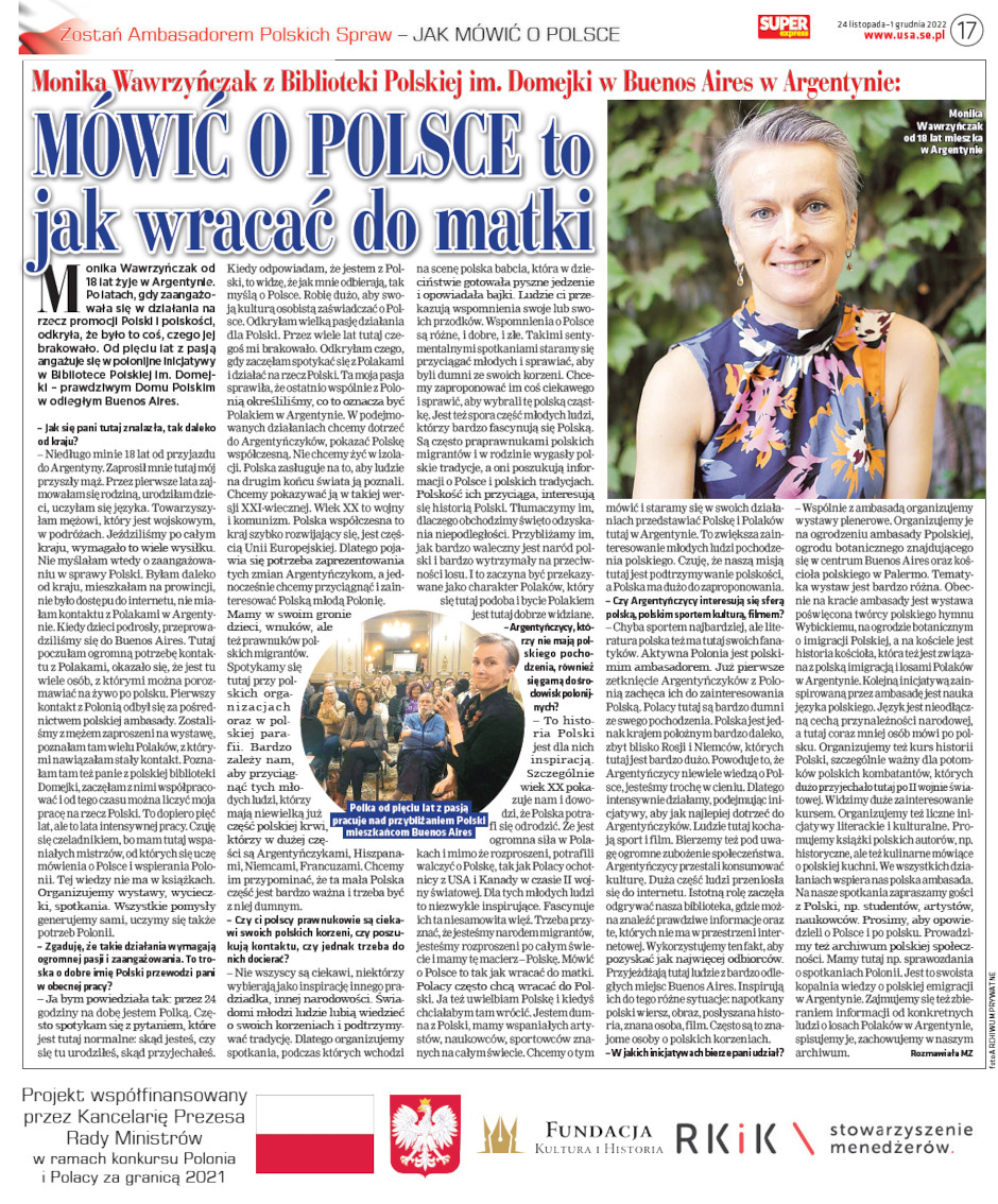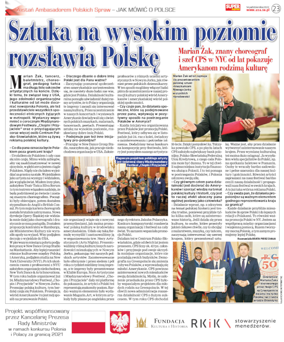 Artykuły z serii "Zostań ambasadorem Polskich spraw" zostały opublikowane w 2022 roku w gazetach polonijnych Super Express Chicago, Super Express NY. W sumie wyemitowaliśmy 8 części serii. Cykl artykułów pokazuje Polaków, którzy bez kompleksów realizują swoje marzenia w różnych częściach świata. Wyróżniają się w swoich środowiskach talentem i determinacją w działaniach. Bez kompleksów działają w swoich środowiskach i realizują śmiałe projekty w różnych dziedzinach: sztuce, kulturze, muzyce, medycynie, fizyce, nowych mediach, informatyce, przemyśle filmowym, grach komputerowych, architekturze.